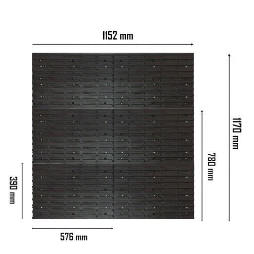 - W zestawie 76 sztuk kuwet, zestaw uchwytów do narzędzi (w sumie 40 sztuk), 8 półek oraz 6 tablic ściennych 576 mm x 390 mm (po złączeniu 173 cm x 78 cm)
