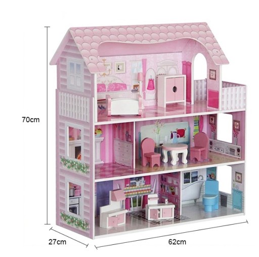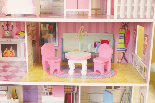 Piękny 3-piętrowy drewniany domek dla lalek z mebelkami i tarasem został wykonana z dużą dbałością o każdy detal. Posiada 5 dużych i przestrzennych pokoi oraz wyjście na taras. Drewniane mebelki i akcesoria są ruchome i można je przestawiać w dowolne miejsca w zależności od wyobraźni dziecka. Domek posiada trzy niezależne poziomy, na których znajduje się łącznie 5 pomieszczeń + taras, a każde z nich utrzymane jest w innej stylistyce (sypialnia, jadalnia,kuchnia, łazienka, salon). Z pewnością sprawi radość Twojemu dziecku i zapewni długie godziny świetnej zabawy. Domek jest całkowicie bezpieczny i stabilny. Idealnie pasuje do każdego wnętrza.