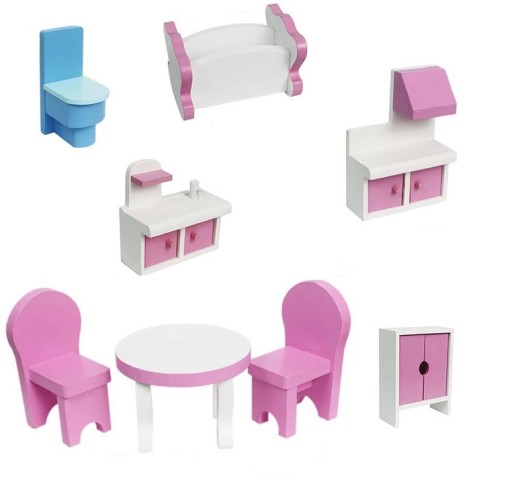 - 9 mebelków przenośnych mebelków wykonanych w 100% z drewna ( stolik, dwa krzesełka, kołyska dla dziecka, szafa z otwieranymi drzwiami, blat kuchenny z otwieranymi drzwiczkami, sedes, szafka, lampa)