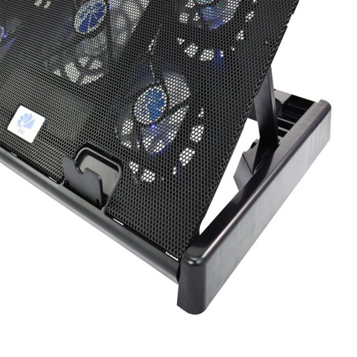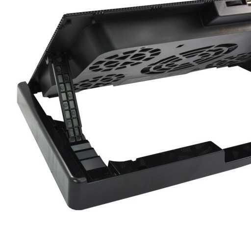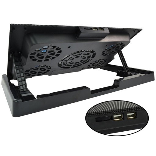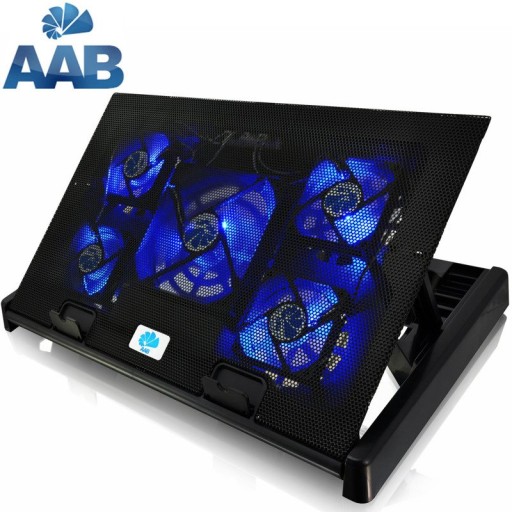 AABCOOLING NC81 Czarna Podstawka pod laptopa to już kolejna podstawka od AABCOOLING, która posiada aż pięć wentylatorów (1 x 120mm oraz 4 x 70mm)! Idealna dla dużych laptopów o panoramicznych matrycach aż do 17 cali. Zapewnia stabilną podstawę pod laptopa, a obrotowy potencjometr umożliwia jednoczesną regulację wentylatorów. Wentylatory pobierają chłodne powietrze spod podstawki i kieruje je na powierzchnie laptopa, zapewnia bardzo niską emisję hałasu podczas przepływu strumienia powietrza. Hydrauliczne łożyska pracują bardzo cicho. Przy ustawieniu najniższych obrotów wentylatorów hałas jest praktycznie niesłyszalny (tryb SUPER SILENT). Dolna część podstawy posiada pięciostopniową regulację kąta nachylenia, tak aby zapewnić jak największą ergonomię pracy. Dodatkowym atutem są niewielkie nóżki zwiększające kąt nachylenia w pozycji płaskiej, antywibracyjne nóżki oraz blokady zabezpieczające przed zsuwaniem się laptopa.