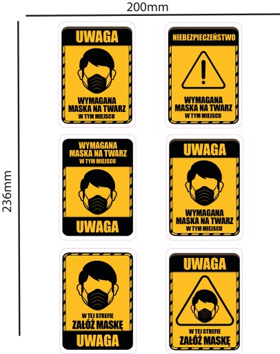 Na tej aukcji oferujemy zestaw 6 naklejek ostrzegawczo - informacyjnych dot. noszenia maseczki w miejscu pracy. Naklejki umieszczone na arkuszu o wymiarze 236mx200mm. Kupując 1 sztukę kupujesz 1 arkusz czyli 6 naklejek.