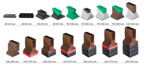 - Precyzja wykonania - ząbkowanie klina i stopi jest bardzo precyzyjnie wykonane, dzięki temu całość osiąga dużą nośność i zapewnia precyzję poziomowania z dokładności poniżej 1 mm,
