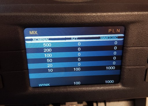 - AUTO – rozpoznawanie waluty/MIX.W – liczenie kilku walut jednocześnie/WYBÓR WALUTY – PLN/USD/EUR itp.
