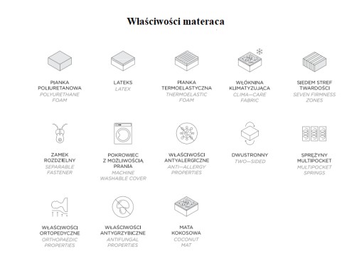 - Materac z jednej strony obłożony został lateksem o grubości 3 cm, pianką poliuretanową o gęstości 24 kg i grubości 2 cm oraz matą kokosową o grubości 1 cm