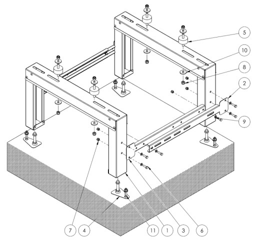 Konstrukcję należy ustawić na trwale wypoziomowanej podstawie. Ewentualne nierówności płaszczyzny montażu mogą zostać wyeliminowane za pomocą stóp ze śrubami regulacyjnymi.