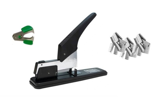 - Wyposażony w długie ramię ułatwiające pracę i znacznie ograniczające użycie siły potrzebnej do zszycia wielu kartek