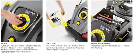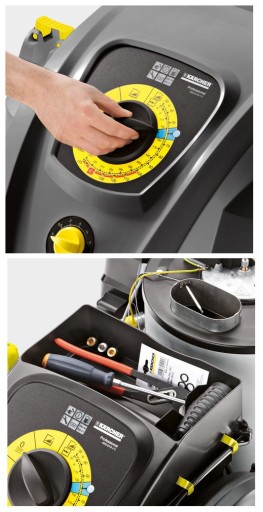 Niezawodne i mobilne – Urządzenia klasy kompakt doskonale sprawdzają się w warsztatach samochodowych, gospodarstwach rolnych, zakładach rzemieślniczych oraz małych przedsiębiorstwach posiadających własną flotę samochodów. Montowany na wejściu dokładny filtr wody chroni pompę przed zanieczyszczeniami. System tłumienia drgań SDS redukuje pulsacje ciśnienia w układzie wysokociśnieniowym. Monitoring temperatury spalin wyłącza silnik po przekroczeniu 300°C zapewniając bezpieczeństwo użytkowania. W standardzie pistolet wysokociśnieniowy EASY!Force Advanced. Technologia EASY!Force redukuje siłę potrzebną do utrzymania spustu pistoletu do zera. Dodatkowo urządzenie posiada system mocowania wyposażenia EASY!Lock pozwalający 5x szybciej zmieniać wyposażenie niż tradycyjny system gwintów. Duże pokrętło obsługowe przeznaczone do włączania i wyłączania urządzenia, wyboru pomiędzy wodą zimną a podgrzaną oraz regulacji temperatury wody. Pokrętłem można ustawić pracę w trybie eco!efficiency. Woda jest wówczas podgrzewana do 60°C, a zużycie paliwa spada nawet o 20%.