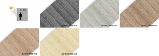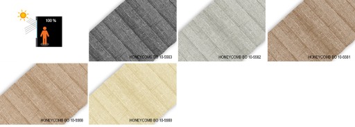 MALEZJA, DAISY, LINDA, HONEYCOMB BLACKOUT - materiał połączony z dwóch plis. Tkanina "plaster miodu" charakteryzuje się mniejszymi załamaniami pliski. W przekroju przypomina plaster miodu. Dzięki specjalnej strukturze z mikroperforacjami i wewnętrzną aluminiową powłoką, wykorzystuje komory powietrzne do dodatkowej izolacji (dźwięku i ciepła) i tym samym podnosi parametry energetyczne okna. Ponadto honeycomb zwiększa estetykę wnętrza, pozwalając na umieszczenie mechanizmów sznurkowych i prowadnic wewnątrz tkaniny.