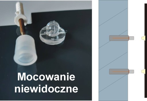 W zestawie dyble oraz specjalne dystanse umożliwiające montaż na klik - dzięki czemu śruby są niewidoczne.