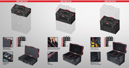Dzięki regulowanym przegrodom oraz 6 wyjmowanym kubełkom każdy użytkownik może stworzyć optymalną dla swoich potrzeb kombinację. Każda skrzynia wyposażona jest w elastyczną uszczelkę, która zapewnia pełną ochronę przed wnikaniem kurzu i wody.