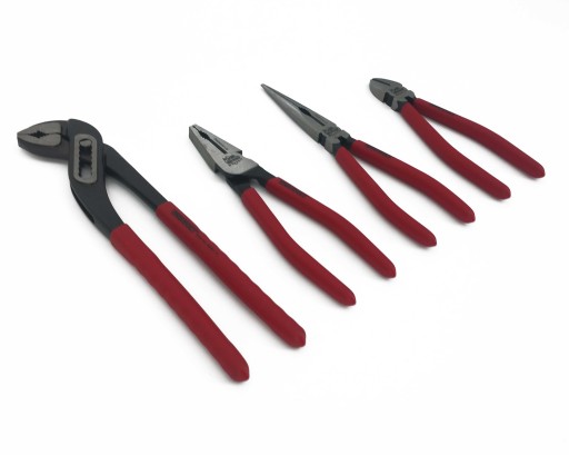 - Zestaw składający się z 4 par szczypiec: szczypiec nastawnych, kombinerek, szczypiec bocznych i płaskich