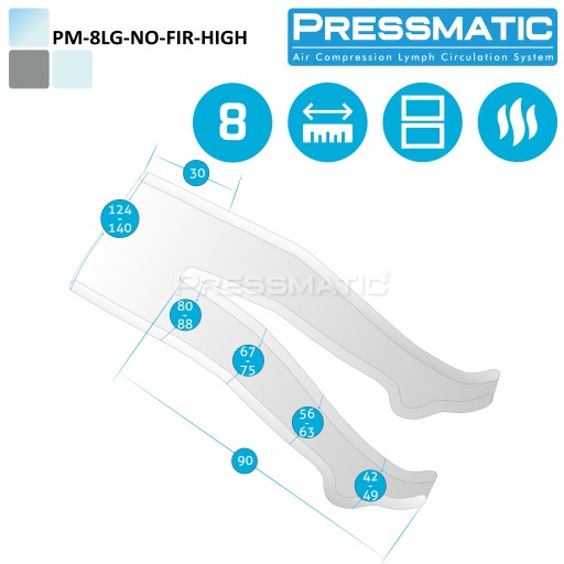 Spodnie uciskowe 8-komorowe są przeznaczone do stosowania z urządzeniem do presoterapii PRESSMATIC PM-24000D. Należy je podłączyć do urządzenia wraz z 16-komorową kurtką. Spodnie uciskowe służą do drenażu limfatycznego nóg. Każda nogawka posiada 4 komory powietrzne. Przestrzeń od kroku wzwyż nie jest wyposażona w komory powietrzne - ten obszar ciała masowany jest przez kurtkę. Spodnie mogą być stosowane zarówno do zabiegów kosmetycznych, jak i do leczenia obrzęku limfatycznego, a także do rekonwalescencji sportowców. Spodnie uciskowe posiadają promienniki światła podczerwonego, więc oprócz presoterapii, można stosować termoterapię FIR. Rozmiar spodni jest uniwersalny i można go indywidualnie dopasować do każdego. W tym celu posiadają system zamków błyskawicznych i pasów ściągających.