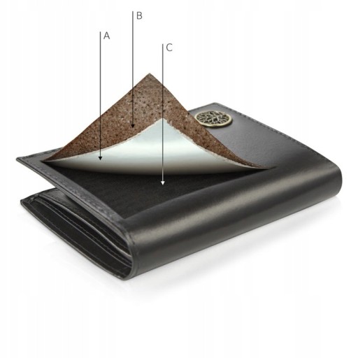 Zewnętrzna część portfela, między skórą (B) a podszewką (C), posiada wbudowaną membranę RFID Secure (A), blokującą przesyłany sygnał. Dzięki niej czytnik oszusta nigdy nie wykryje karty zbliżeniowej, a Twoje pieniądze będą zawsze bezpieczne.
