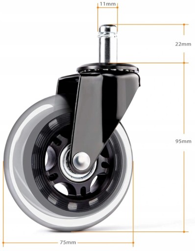 ▶ Kółka zostały zaprojektowane z myślą o jak największej uniwersalności. Dzięki czemu uzyskaliśmy model, który pasuje jednocześnie do foteli biurowych, obrotowych, gamingowych, hokerów, mebli itp.