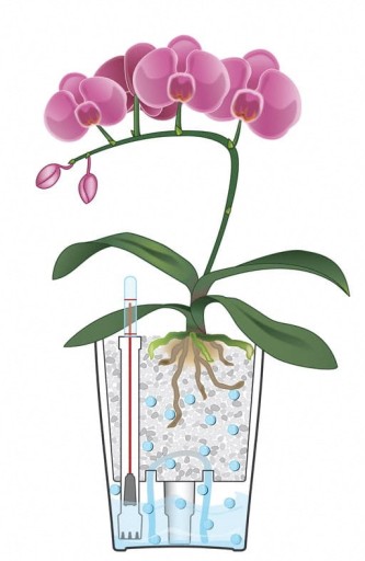 Komplet „All-Inclusive” zawiera doniczkę, wkład wewnętrzny, wskaźnik poziomu wody, knot podciągający wodę, substrat LECHUZA-PON.