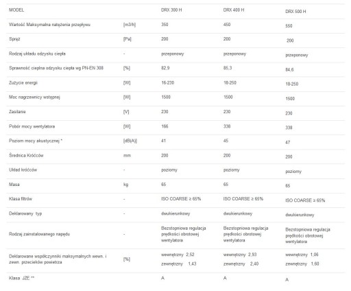 Rekuperatory serii DRX wykonane są w konstrukcji stalowej. Zastosowano w nich niskoszumowe i niskoenergetyczne wentylatory z silnikami prądu stałego EC. Produkowane są w dwóch wydajnościach 350, 450 i 550 m3/h co w dużym uproszczeniu w zupełności wystarczy nam do komfortowego wentylowania domów mieszkalnych o powierzchni do ok. 200 m2.