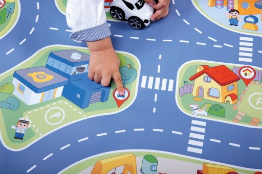 Mata podłogowa to idealne miejsce dla maluszka na pierwsze aktywności. Bogato wyposażona mata pozwoli dziecku bawić się, poznając jednocześnie świat i rozwijając swoje umiejętności. Mata Miasto Turbo Touch to ogromna powierzchnia (110 x 60 cm!) przedstawiająca kolorowe miasto, gdzie maluch super szybkimi mini samochodami może zwiedzać każdy jego zakamarek. Każdy z punktów na macie jest punktem docelowym, zazwyczaj dobrze znanym każdemu dziecku mieszkającemu w mieście. Są to: posterunek policji, park, remiza strażacka z lądowiskiem dla helikoptera, warsztat, park, plaża miejska oraz plac budowy z dźwigiem i betoniarką. Do każdego punktu prowadzą ulice. Dziecko może przetrenować podstawowe zasady ruchu drogowego: zatrzymywanie przed pasami dla pieszych, ruch na rondzie czy parkowanie. Gdy samochód dziecka dotrze do jednego z tych punktów zabawka wyda efekty dźwiękowe, charakterystyczne dla tego miejsca: okrzyki dzieci, sygnały ostrzegawcze, odgłosy plażowania, policyjny gwizdek i inne. W sumie mata oferuje aż 15 punktów, na które można najechać autkiem lub przycisnąć, aby wydobyć z nich dźwięki.