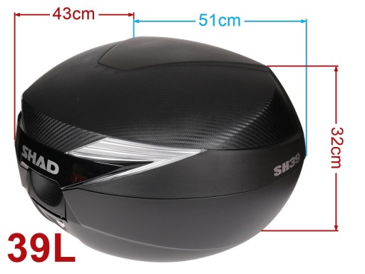SH39 to kompaktowy i praktyczny kufer centralny, wykonany z wysokiej jakości wzmocnionego polipropylenu, który może pomieścić modułowy kask i rękawice. Dzięki zakrzywionym kształtom i ma idealny rozmiar do skuterów i motocykli.