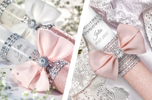 Świeca do Chrztu Świętego owinięta jest brokatowym, mieniącym się materiałem w kolorze pudrowego różu. Ozdobiona jest paskami cyrkonii, które całej świecy nadają eleganckiego charakteru glamour. Elegancka kokardka wraz z biżuteryjnym zdobieniem idealnie dopełnia całość.