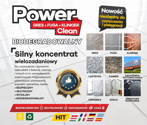 NOWOŚĆ Power Gres Fuga Klinkier Clean - KONCENTRAT do GRUNTOWNEGO czyszczenia gresu, kafelek, fug, osadów z kamienia, kabin prysznicowych, armatury łazienkowej, płytek tarasowych, klinkieru, dachówki, ceramiki, kostki brukowej, basenów, instalacji nawadniającej, deski tarasowej, płotów ogrodowych, doniczek ceramicznych, nagrobków, płyt z lastryko, pomników, muru ceglanego, cegły, zabytków, szkła, fotowoltaiki, klatek schodowych.