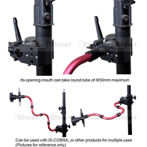 4. Może być używany z ramieniem fotograficznym IS-COBRA (sprzedawanym oddzielnie) lub innymi produktami wielokrotnego użytku. Może być przymocowany do biurka, półki na książki, statywu, statywu oświetleniowego wewnątrz; Lub do poręczy, słupa lampy, gałęzi drzewa, drewnianej deski na zewnątrz, bardzo wygodne.