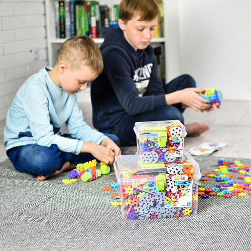 Travel box Constructor to zestaw klocków, który zawiera 1000 elementów. Klocki w pięknych soczystych kolorach uzupełnione o dodatkowe elementy takie jak koła, łączniki czy sześciokąty.