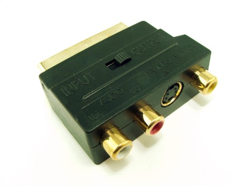 Przejście EURO - 3 gniazda RCA + SVHS + przełącznik. Przejście wyposażone w złącza EURO, RCA oraz S-VIDEO. Przeznaczona do podłączenia kamer video, konsol do gier i innych urządzeń wyposażonych w wyjście RCA lub S-VIDEO do starszych odbiorników telewizyjnych posiadających jedynie złącze EURO. Dodatkowo przejściówka wyposażona jest w przełącznik Input/Output, sterujący tym, czy złącze EURO ma odbierać, bądź nadawać sygnał.