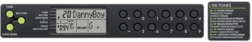 100 brzmień wysokiej jakości obejmują wszystkie grupy instrumentów - od klasycznego pianina do syntezatorów. Łatwy wybór brzmień za pomocą klawiatury numerycznej oraz przycisków "+" i "-".