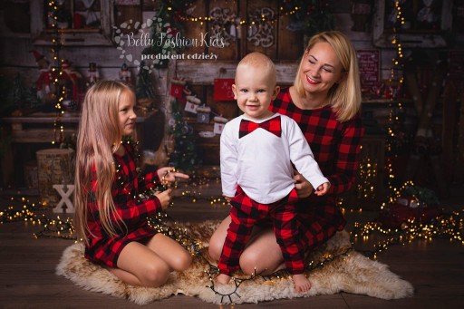 Dwuczęściowy, sportowo - elegancki zestaw chłopięcy składający się z bluzki z długim rękawem typu long z modnym, przedłużanym tyłem oraz ozdobną, naszywaną muszką oraz długich spodni w czarno-czerwoną kratę z 2 kieszeniami i gumą w pasie. Całość wykonana z wysokiej klasy bawełny - przyjemnej i miłej w dotyku. Dzięki domieszce elastanu dobrze się naddaje zapewniając maximum wygody.