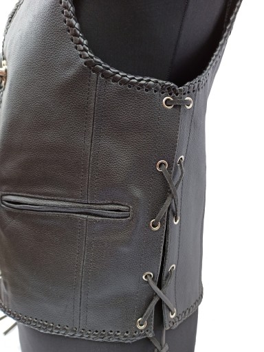Kamizelka wykonana ze skóry bydlęcej, ceniona przez kluby motocyklowe, brak szwów na tylnej części, dzięki czemu idealnie się ją obszywa