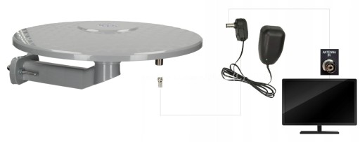 Antena DVB-T dostarczana jest wraz z końcówką typu F gotową do zamontowania na przewodzie koncentrycznym np. RG-6 (brak w zestawie). Antena wyposażona jest w zasilacz sieciowy 230V AC który zapewnia prawidłowe funkcjonowanie wzmacniacza wbudowanego w antenie. Przewód koncentryczny należy prawidłowo zamontować wewnątrz wtyku zasilacza antenowego. Następnie należy podłączyć zasilacz do prądu a wtyczkę podłączyć do znajdującego się w odbiorniku telewizyjnym gniazda RF-IN (Antenna IN). Jeżeli Twój telewizor nie posiada wbudowanego tunera do odbioru cyfrowej telewizji naziemnej DVB-T / DVB-T antenę podłączamy w taki sam sposób do zewnętrznego tunera DVB-T / DVB-T2. Dołączony zasilacz sieciowy przystosowany jest do pracy wewnątrz pomieszczeń.