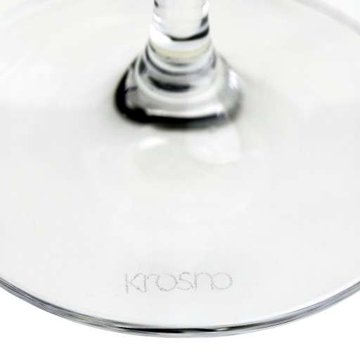 Kieliszki sygnowane są logo producenta w formie naklejki którą w łatwy sposób można usunąć oraz subtelnym grawerem laserowym KROSNO na spodzie wyrobu.