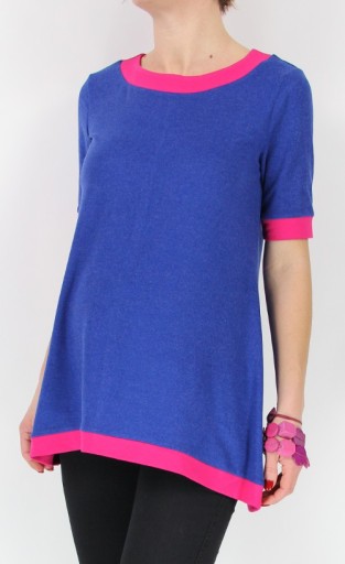 TUNIKA Z WISKOZY W KOLORZE NIEBIESKIM Z DODATKIEM MELANŻOWEJ NITKI ,WYKOŃCZENIA W KOLORZE FUKSJA - OBA KOLORY DOSKONALE WSPÓŁGRAJĄ.