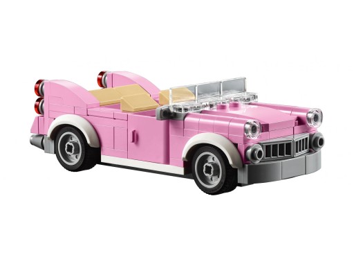 - W 3-poziomowym budynku baru w śródmieściu znajdziesz szereg detali zbudowanych z klocków: utrzymaną w stylu późnego Art Deco fasadę w kolorach różu i morskiej wody z wielkim szyldem „DINER”, zewnętrzne schody, łukowate okna, rynnę, balkony, dekoracyjny dach z otwieranym świetlikiem i tarasem, a do tego szczegółowo oddany chodnik ze skrzynką pocztową, parkometrem, donicami i ozdobną latarnią. W zestawie znajdziesz również różowy kabriolet w stylu lat 50.
