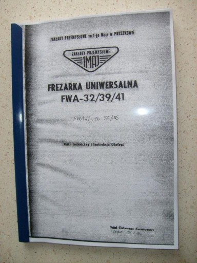 Instrukcja obsługi frezarki uniwersalnej FWA - 32/39/41 produkcji Zakładów 1 Maja w Pruszkowie. DTR-ka zawiera 65 stron opisu działania i obsługi + 19 rys schematów i niektórych części zamiennych.