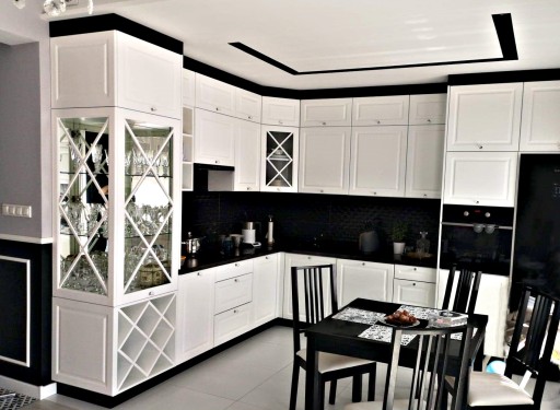 Prezentacja kuchni Naszego klienta. Fronty angielskie, wzór AVERTEN oraz witryna AROMA, lakierowane biały mat.