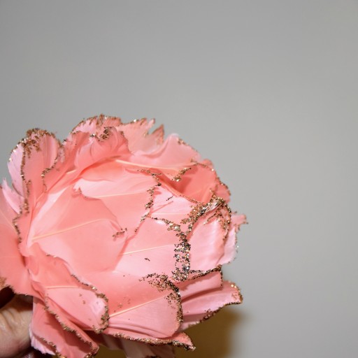 Wykonany ze styropianu i piór kwiat na eleganckiej wstążce będzie oryginalną ozdobą nie tylko choinki.