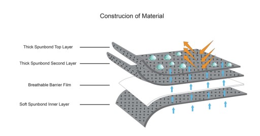 - boczne płaty wykonane z mocnego materiału, membrany wodoodpornej SPUNBOND, powlekanej polietylenem