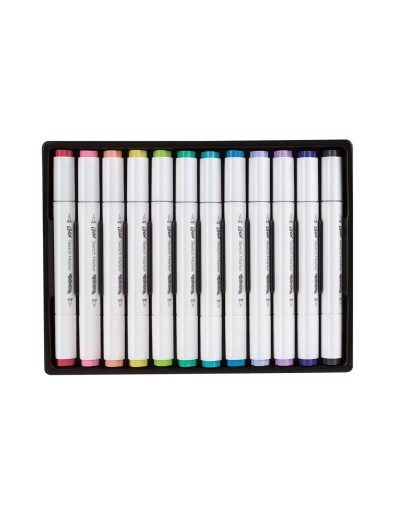 Pastelowa edycja wysokiej jakości markerów do szkicowania z dwoma końcówkami: w kształcie pędzelka do wykonywania miękkich i łagodnych linii oraz szerokiej, ściętej końcówki przeznaczonej do kolorowania większych powierzchni.