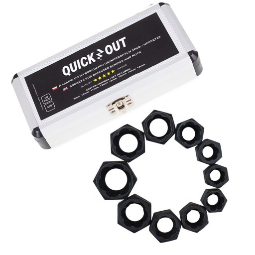 QUICK OUT to specjalnie hartowane nasadki z zabezpieczeniem antykorozyjnym przeznaczone do odkręcania obrobionych lub uszkodzonych głów śrub