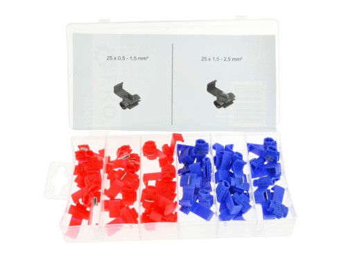 Szybkozłączki są w dwóch kolorach i rozmiarach, pasujących do najbardziej popularnych średnic przewodów elektrycznych. Zestaw zawiera 50 elementów, a całość umieszczono w wygodnym sortowniku.