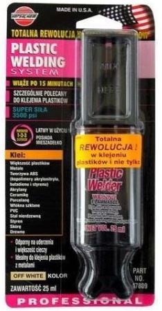 Najlepszy na rynku klej do profesjonalnego łączenia wszelkiego rodzaju powierzchni, szczególnie plastików. Klienci, którzy raz kupili Plastic Welding nie szukają już innego kleju. Posiada unikalne składniki używane przy produkcji plomb dentystycznych, co pozwala uzyskać najwyższą jakość i trwałość wiązania. Łączy ze sobą "na zawsze" większość plastików i tworzyw sztucznych, metali a także ceramikę, porcelanę, włókno szklane, szkło, drewno i wiele innych materiałów. Zaczyna wiązać już po 4 minutach. Po 15 minutach można poruszać klejonymi przedmiotami. Pełną wytrzymałość uzyskuje już po 1 godzinie. Po 24 godzinach spoina wytrzymuje 238 atmosfer (246kg/cm2). W temperaturze poniżej +13° C czas utwardzania ulega wydłużeniu. Odporność temperaturowa od -40°C do +93°C. Jest wodoodporny. Doskonale wypełnia drobne szczeliny. Nie wiąże plastików wykonanych z polietylenu i polipropylenu. Przechowywać w temp. od +1°C do +24°C.