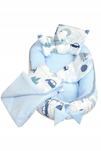 Kokon uszyty jest z bezpiecznych materiałów najwyższej jakości. Zestaw jest dwustronny. Jedna strona została wykonana z tkaniny bawełnianej 100%, druga natomiast z miłego w dotyku, ciepłego Velvetu.