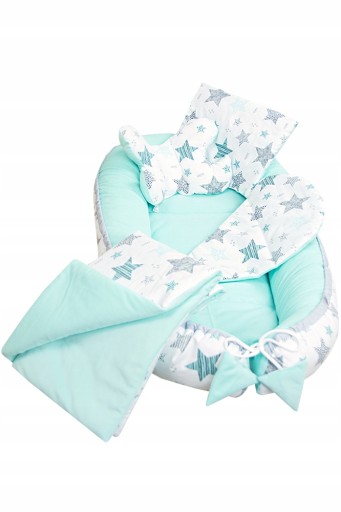 Kokon uszyty jest z bezpiecznych materiałów najwyższej jakości. Zestaw jest dwustronny. Jedna strona została wykonana z tkaniny bawełnianej 100%, druga natomiast z miłego w dotyku, ciepłego Velvetu.