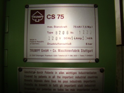 SPRZEDAM WYKRAWARKĘ -SZTANCE PRODUKCJI NIEMIECKIEJ TRUMPF CS 75. WYKRAWARKA JEST W STANIE TECHNICZNYM BARDZO DOBRYM WRECZ IDEALNYM. PRACUJE B. CICHO ,POSIADA STEROWANIE RĘCZNE I NOZNE ,KILKA ZAKRESOW PRĘDKOSCI. MOŻNA OBRABIAĆ BLACHY O WYMIARACH 1250*2000 MM ,NACISK 75 KN ,WAGA OK 2500 KG .DOŁĄCZONE NARZĘDZIA MAJĄ NASTEPUJĄCE WYMIARY: OKRĄGŁE: FI 3 , 5 , 6 ,7 , 21 , 27 ,28 30 ,32 ,38 ,45 , 60 ,74 , 75 MM. FASOLKI: 15*9 , 20*8 , 25*11 , 30*6 , PROSTOKĄT 20*3 oraz STEMPLE I MATRYCE DO CIĘCIA WZDŁUŻNEGO