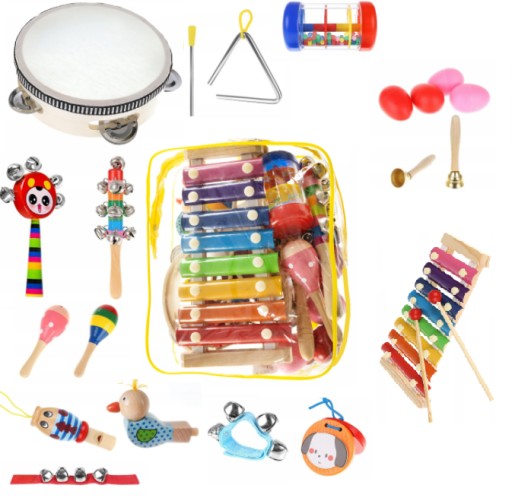 W praktycznym plecaczku znajdują się: cymbałki, tamburyno/bębenek, grzechotki, gwizdki, trójkąt, kastaniety, oraz dzwoneczki. Ten fantastyczny pakiet instrumentów znajdujący się w przeźroczystym plecaczku z całą pewnością podudzi ciekawość każdego malucha. Dla wielu dzieci stanie się inspiracją, a może nawet rozwinie zmysł muzyczny, który w przyszłości zaprocentuje w tej dziedzinie. Większość instrumentów wykonana jest z drewna, pokryta kolorowymi wzorami, które wpadną w oko każdemu maluszkowi. Plecaczek wyposażony jest w instrumenty, które pozwolą dzieciom poznać najważniejsze dźwięki, które zaczynają tworzyć rytm oraz muzykę.