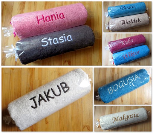 Ta aukcja i cena dotyczą kompletu 2 szt. dużych ręczników kąpielowych 70x140 cm z Twoim haftem w postaci imienia lub dowolnego 1 SŁOWA (bez grafiki).