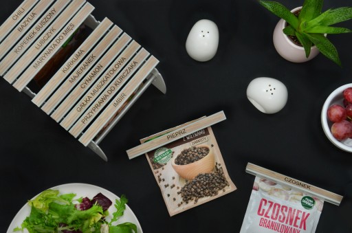 Ideą przyświecającą ich stworzeniu było to, aby zajmowały jak NAJMNIEJ MIEJSCA , utrzymywały jak najdłuższą świeżość i aromat, były łatwo i szybko wyszukiwane podczas przyrządzania wszelakich potraw. W standardowym zestawie znajduje się lista naklejek z nazwami najpopularniejszych przypraw oraz 3 naklejki z możliwością opisania swoich ulubionych ziół. Praktyczne grzbiety pozwalają utrzymać saszetkę oraz zapewniają wygodę, estetykę oraz zapobiegają wietrzeniu ziół. Przyprawnik nie tylko świetnie się prezentuje, ale gwarantuje również komfort i przyjemność podczas przygotowywania posiłków.