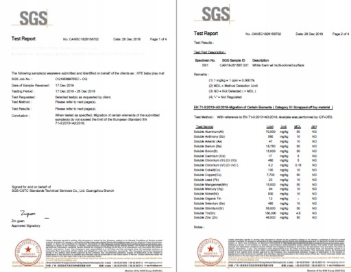 Mata została przebadana i otrzymała certyfikat bezpieczeństwa firmy SGS - światowego lidera w dziedzinie kontroli, testowania i certyfikacji produktów. Wykonana jest z całkowicie bezpiecznego dla zdrowia dzieci bezzapachowego materiału XPE, który nie zawiera Bisfenolu A (BPA), PVC, ftalanów ani formamidu. Spełnia europejskie normy EN71 dotyczące bezpieczeństwa użytkowania.
