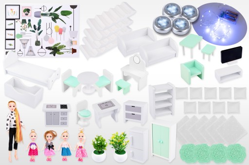 Piękny trzypiętrowy domek jest w pełni wyposażony, posiada duże przestrzenne pomieszczenia, w których bez przerwy można przestawiać piękne drewniane mebelki i akcesoria. Domek w całości pomalowany na biało - połysk.